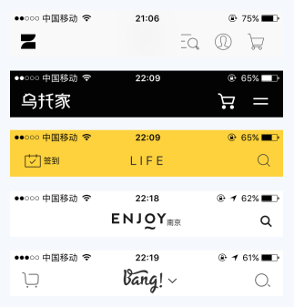 每个应用都有一个标题栏,这成了App的标准设计了。标题栏上一般会有三个重要的元素组成:logo图形或者文字、搜索页的入口、购物车的图标。