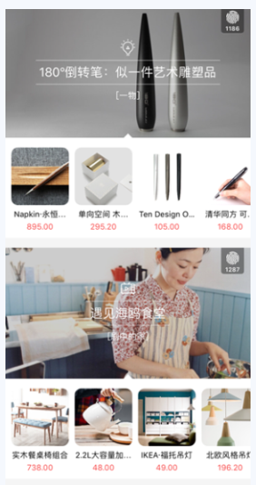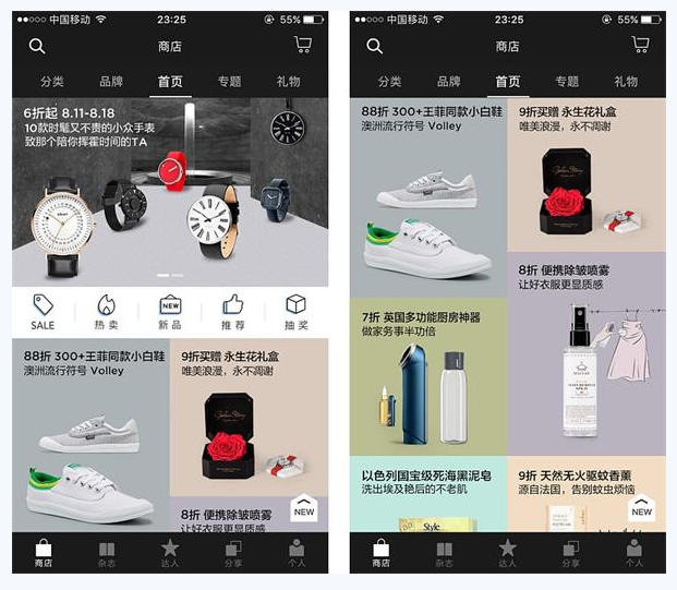 垂直类电商,首页需要放置各种专题推荐,来导购各种商品。各种编辑精选,达人推荐,热卖商品。对于用户来说本质就是推荐商品。所以用户并不在乎你的内部各种叫法分类。那么一些电商直接打破了那种综合B2C电商的豆腐块做法。而是用了卡片化设计。各种推荐内容就是一个个卡片设计,这种设计的优点就是足够精简,看起来有格调感。缺点就是信息密度很低,容纳不了足够多的信息。