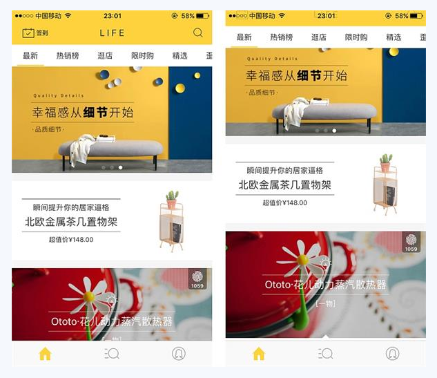 因为Banner设计的形式比较单一,采用图片+文字的视觉样式。每个楼层就是一个小模块,那么模块与模块之间的如何通过视觉手段进行区分了?Life应用采用了1+N的设计形式。设计样式上,Life上半部分大Banner加半透明黑底,下半部分用白色背景,有一个白色上三角,这样很清晰让用户明白,下半部分的商品是从属于上半部分的专题。