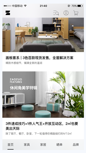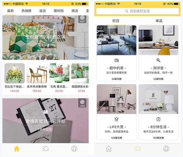 这个应用主要是帮你挑选家居各种物品搭配。适用于追求生活品质,喜欢家居中各种各样精致小物件搭配的用户群体。里面的各种专题内容质量很高,值得翻阅。首页下banner专题设计上的图标设计非常精致。与板块内栏目上的图标相对应,板块描述非常清晰。