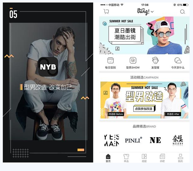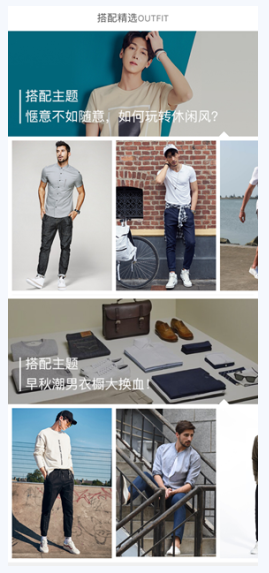 下半部分Banner采用了176*176PX(1:1)的小图。这样图片比例符合之前分析的专题图适合16:9,商品图适合用1:1。这样的大小比例看起来可以让版块之前区分的很清楚。当然如果下半部分图片一定要使用小图,否则看起来层次就混乱,。例如男衣邦的首页,上图和下图的比例看起来非常的接近。模块层次区分的就不是非常好。
