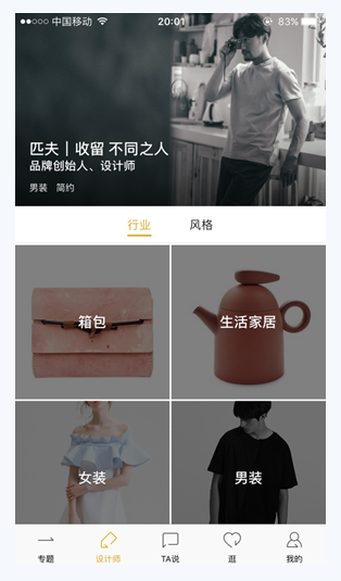 是一家突出“好设计、纯手工”的购物分享平台。专为时尚达人提供前沿的设计理念与产品。想去的主导航栏图标和应用图标的设计语言结合紧密。运用了一个小勾这个图形元素贯穿了图标的设计。其中TA说中的banner图可以显示动图,非常的生动有意思。