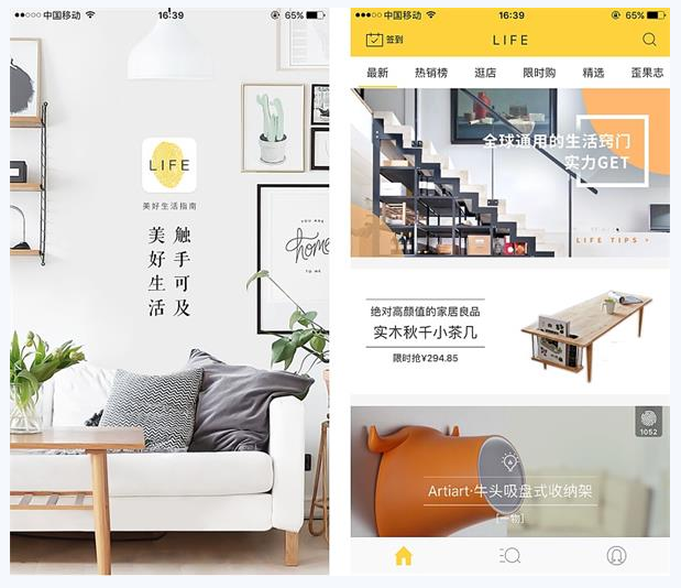 一些垂直类电商的首页设计形式单一,完全由banner图构成。用户向上滑动页面,标题栏会自动隐藏,让用户有更大的页面显示面积。例如Life应用,至于向上滑动多少像素开始隐藏标题栏,你需要给程序员定义出高度。
