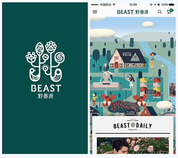 野兽派是综合类的时尚类家居相关售卖平台。野兽派本来是一个买花起家的应用,她卖的不是花,而是花一般的美好的生活理念。随着越做越大,品类也扩张到各种家居、美妆、香氛、配饰和美食等。这里比较吸引人的是野兽派的首页交互设计。使用一个整张插画,作为首页各种子模块店铺的入口。这样的设计别具一格,的确第一眼非常的吸引人。