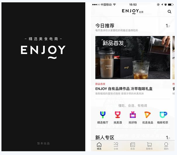 一个“懂吃、会选、有格调”的美食电商平台。这个和大众点评不一样的是, ENJOY挑选的一些餐厅中,有的具备米其林元素的星级餐厅,有的是精雕细作的家庭小馆,有的则以食材产地或料理手法取胜……和时装领域的买手店类似,“ENJOY-精选限量美食”的核心竞争力是对餐厅和菜品的有效筛选的能力,既不做大众化的自助餐,也很少接触连锁品牌。所以在这里不是以价格吸引人,更多的是那些精致餐厅的推荐。