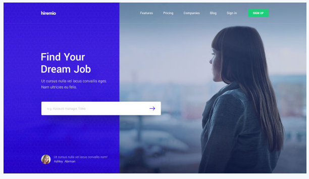△左右分屏是最近一年比较流行的布局方式之一,这种布局能够更加强调品牌的色彩调性,避免图片与文字的叠加干扰阅读,带来的问题就是中间死板的分割线,设计师将输入框横跨了两个模块,巧妙地打破了这个死板的形式