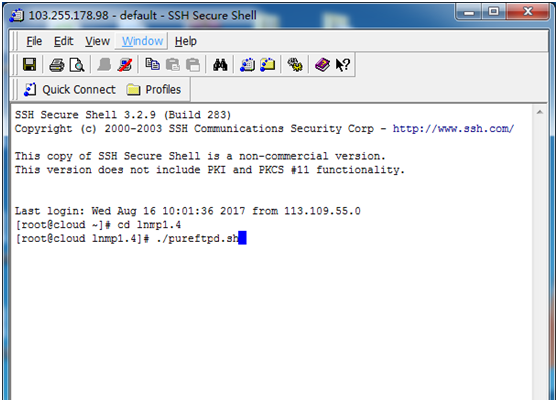 1、登录我们的服务器(省略掉),进入lnmp1.4目录,安装pureftpd,命令:cdlnmp1.4执行安装程序:./pureftpd.sh回车后提示任意键继续或者Ctrl+C取消,我们回车继续。