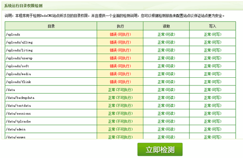 这里分别对DedeCMS系统涉及到的站点目录中执行、读取、写入权限进行检测,尤其是执行权限,是安全设置中的重要环节,具体配置可以参看:《如何取消服务器/主机空间目录脚本的执行权限》。