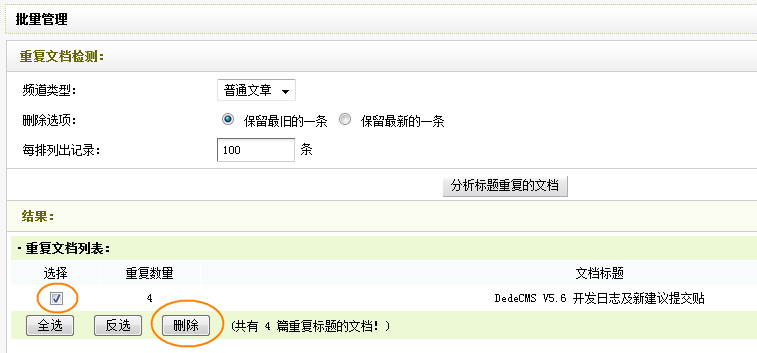 点击按钮“分析标题重复的文档”后,在筛选的结果中勾选需要删除的文档,然后点击删除,即可把重复文档删除。