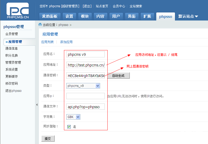 然后查看设置->phpsso设置中的应用id、接口地址、加密密钥、版本号和phpsso->应用管理->编辑应用中的对应选项是否一致。